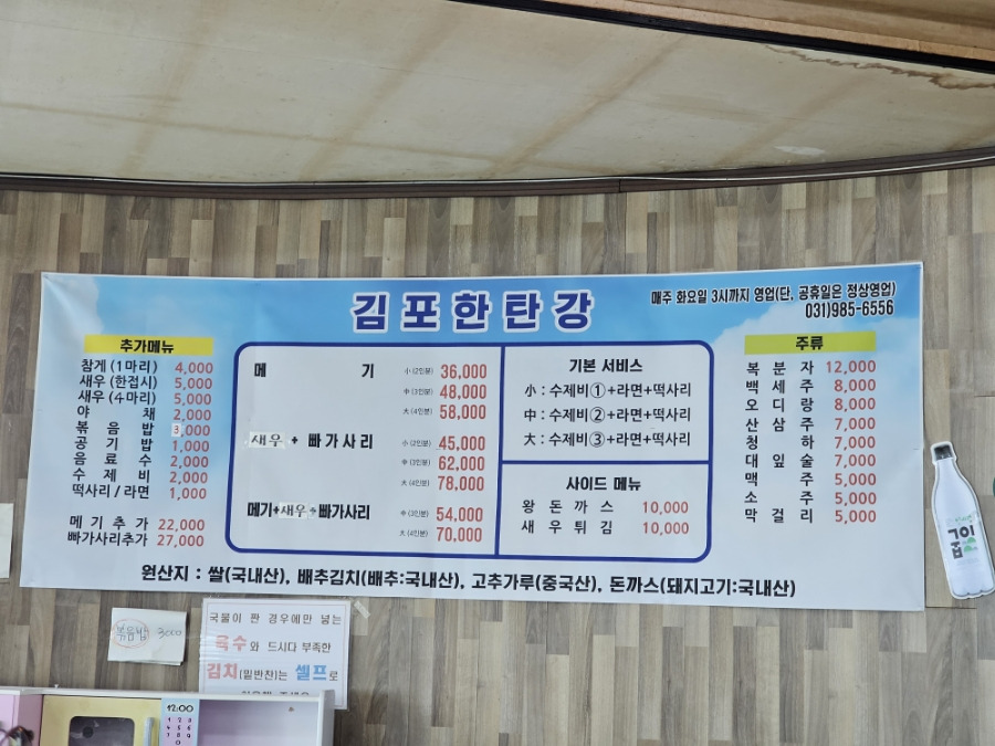 김포한탄강 가격이랑 메뉴판이 이렇게 현수막으로 걸려 있어요.